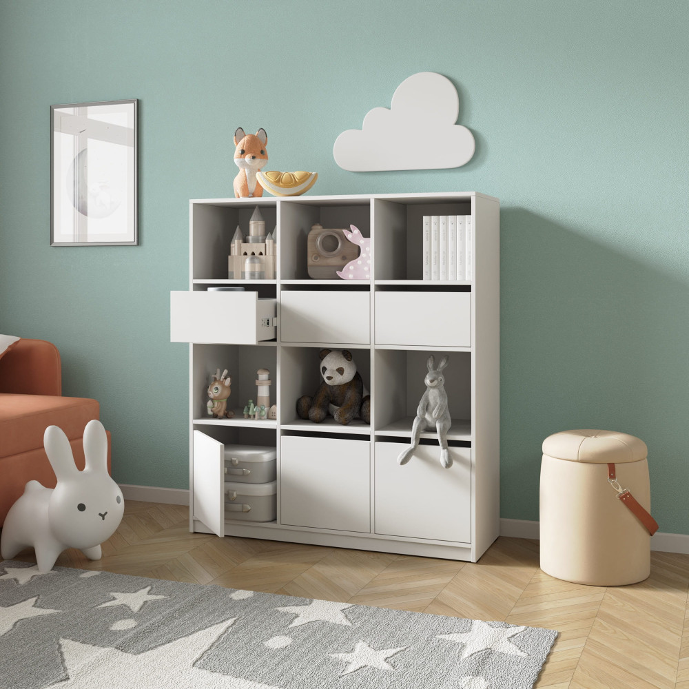 Стеллаж в детскую комнату с ящиками и дверками Белый