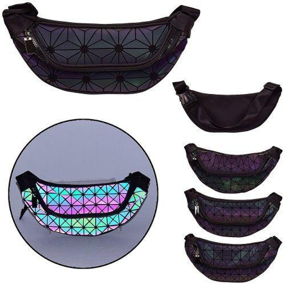 Светоотражающая сумка бананка. Лицевая поверхность переливается разными цветами при попадании на нее лучей солнца или яркого искусственного света фар автомобилей, ламп или фонарей. При неярком освещении изделие имеет серовато-фиолетовый оттенок, но также переливается. Имеет 1 отделение, которое застегивается на молнию. Размер сумки- 33х13х9 см. Длинна ремешка регулируется. Разные виды геометрических принтов в ассорименте.
