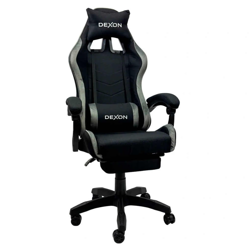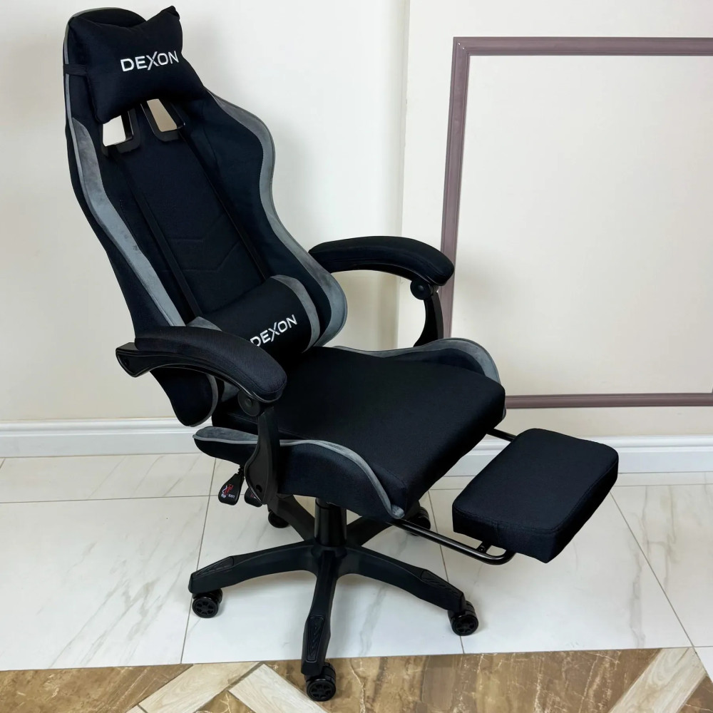 Ергономічне крісло з висувною підставкою для ніг поєднує м’яку тканину з велюровими вставками для максимального комфорту. Подушки для шиї та поясниці зменшують навантаження на спину, спинка регулюється до 135°, висота сидіння 47–57 см.