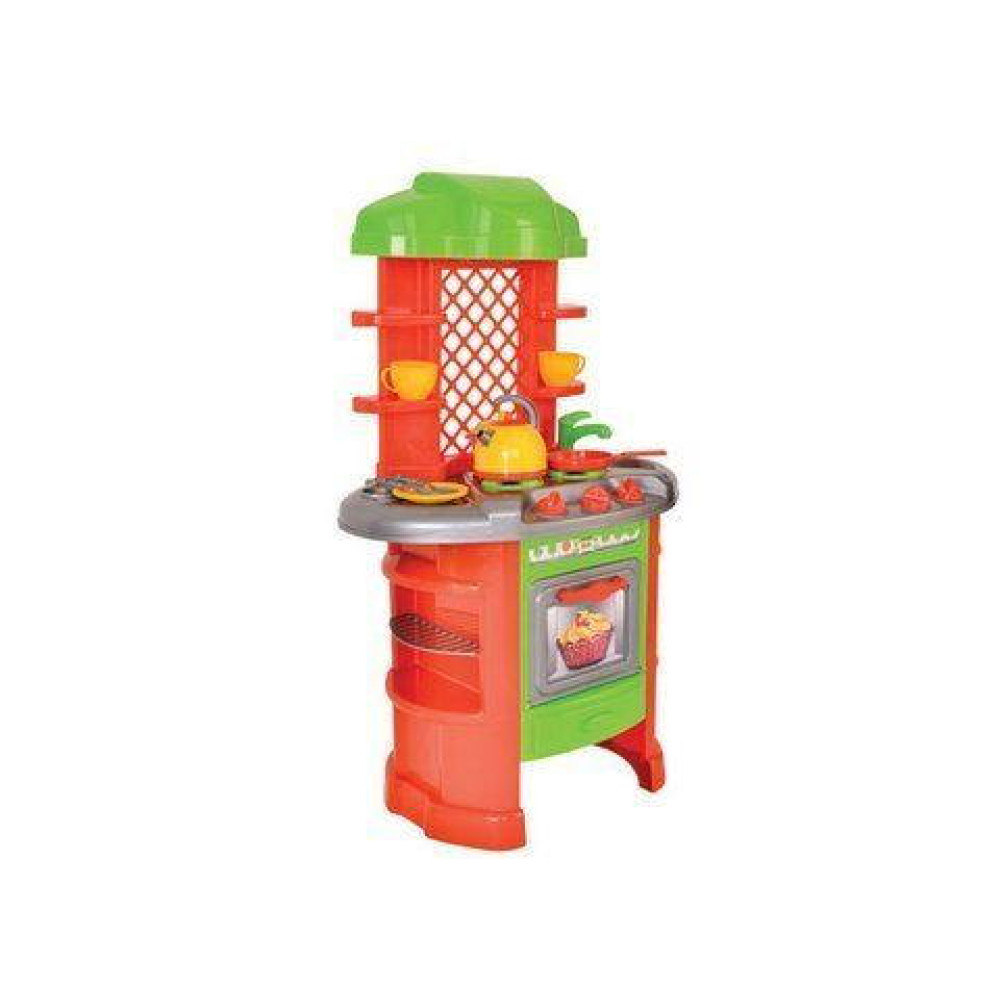 Комплектація:Плита з трьома конфорками, мийкою, краном і поличками, сковорідка, каструля, 2 тарілки, 2 чашки, столові прилади, чайник