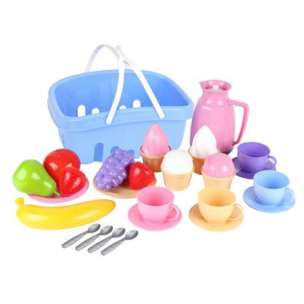 Корзина, кофейник с крышкой, 4 чашки с блюдечками и ложечками, 2 тарелки, 4 различные формочки в виде «кексов со сливками», виноград, яблоко, груша, банан, 2 клубники |