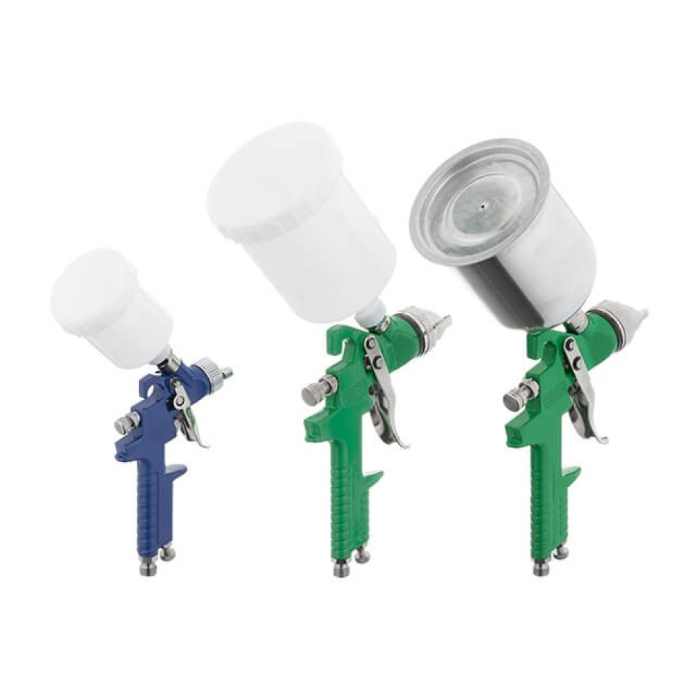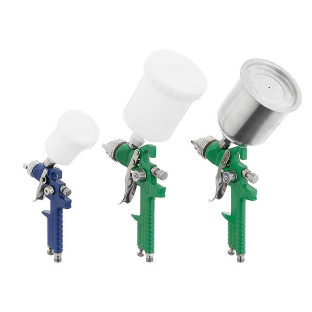Набір з 3-х фарбопультов HVLP, 0,8мм, 1,3мм, 1,7мм, регулятор тиску, два пластикових та один металевий бачок - Фото 1