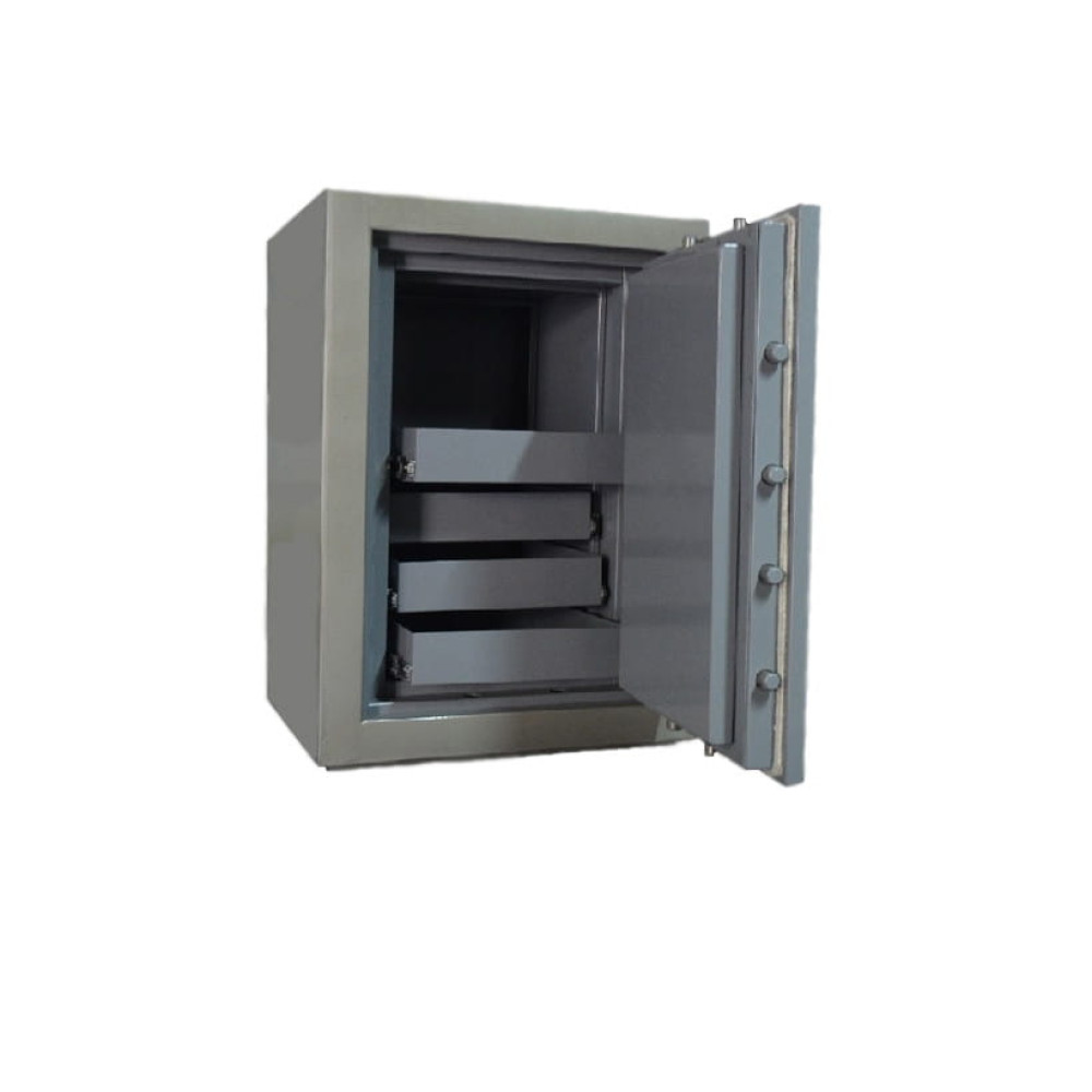 Товщина дверей 120 мм. Інтер'єр сейфа: сейф оснащений чотирма шухлядами з можливістю перестановки по висоті.