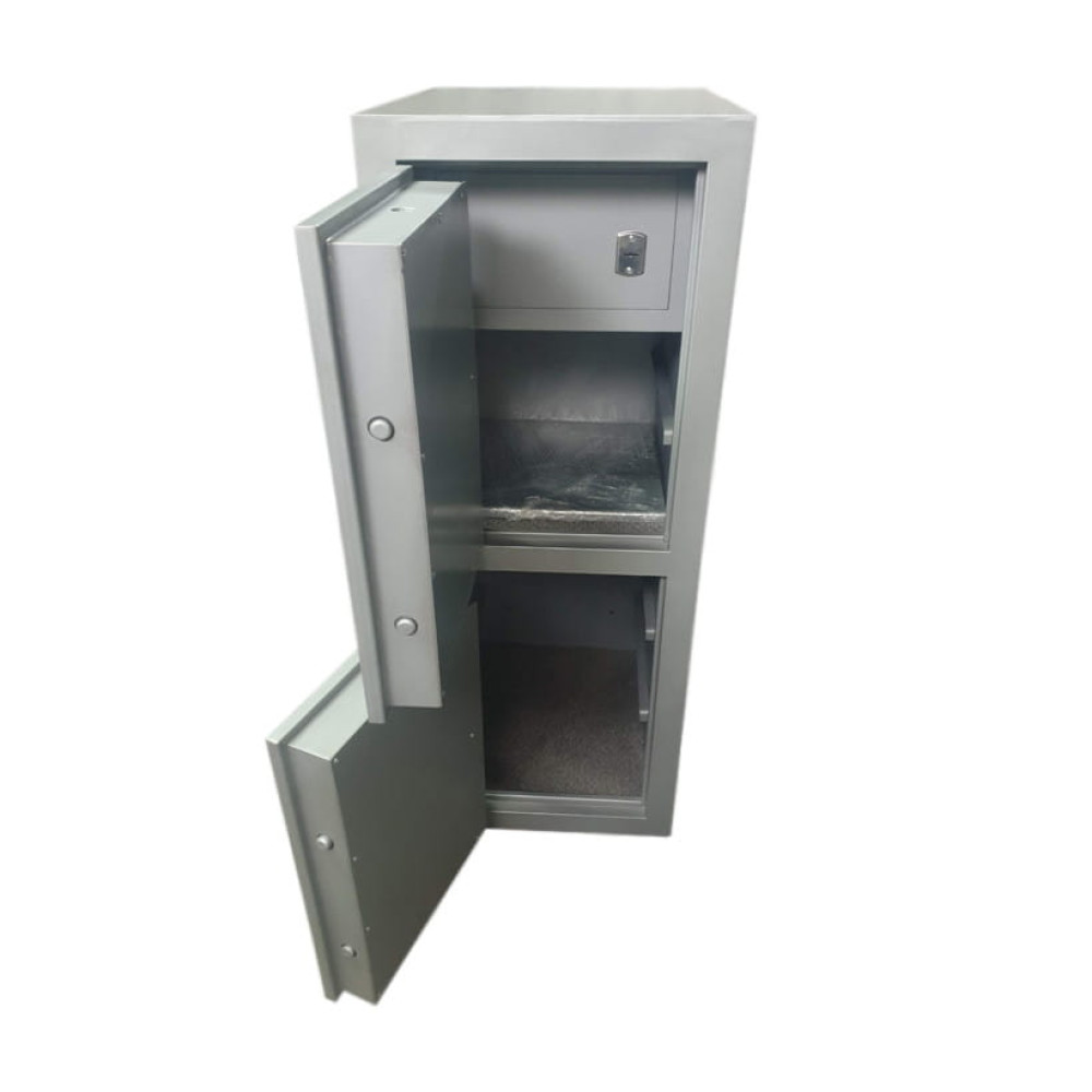 Інтер'єр сейфа: у верхньому відділенні сейфа встановлено трейзер і знімну полицю, в нижній частині сейфа встановлено знімну полицю зі зміною за рівнем.