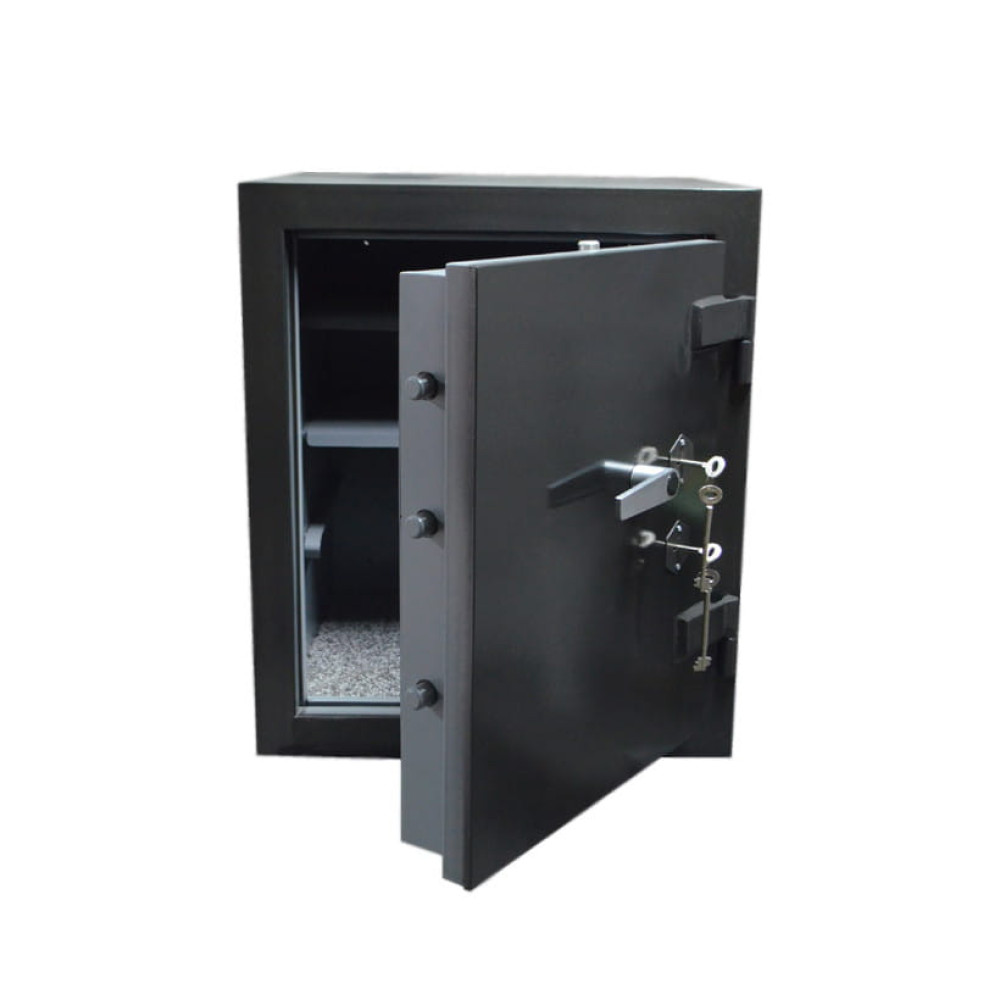 Вогневзломостійкий сейф призначений для зберігання документів та цінностей під час пожежі. Корпус вогневзломостійкого сейфа посилений профільною трубою з боку дверей, що надає конструкції додаткову жорсткість та підвищує рівень стійкості до злому. Двері даного сейфа виконані врівень із зовнішніми петлями для повного відкриття дверей. Конструкція дверей сейфа працює як антизріз петель. Сейф виготовляється з листів сталі товщиною 3,0 мм (корпус) та 5,0 мм (дверна плита).