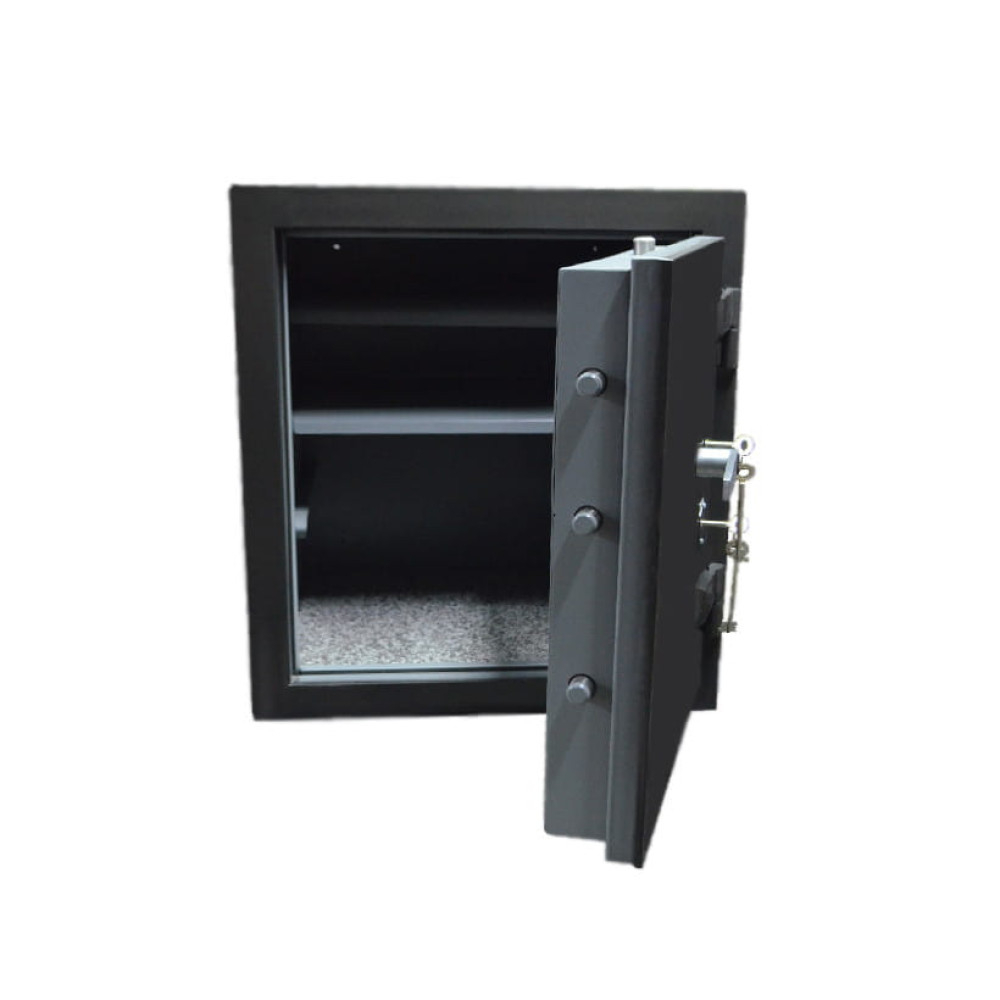 Сейф оснащений двома механічними (MAUER (Німеччина), class A - EN 1300:2004) замками з ригельною системою замикання на 5 ригелів по 22 мм діаметром кожен, вихід у горизонтальній площині у трьох напрямках. Це надійний ключовий замок сувальдного типу, що захистить ваше майно від сторонніх. Для відкриття ригелів сейф оснащений поворотною ручкою. В вогневзломостійкому сейфі при заливанні дверей та корпусу використовується вогнестійкий армований бетон. Товщина армованих стін сейфа 40мм. Конструкція дверей посилена профільною трубою. Чотиришарова система дверей складається з 3 листів металу. Товщина дверей 90 мм. Заповнення бетоном 20 мм. З наповненням вогнестійкою плитою. Властивості матеріалу: не горить, не виділяє диму. Відповідає класу А1 Євростандарту. Витримує температуру горіння 1200С протягом 240 годин до початку руйнування. Лабораторні дослідження показали: понад 50 циклів заморожування-відтавання не призводять до руйнування. Екологічно чистий матеріал. По периметру проклеєна термострічка.