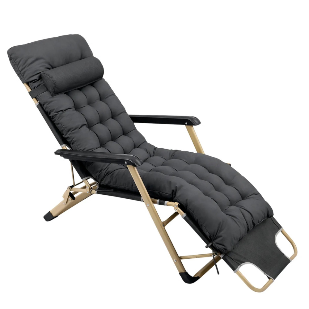 Матрац товщиною 6 см рівномірно підтримує тіло, зменшуючи навантаження на спину та м’язи. Посилений металевий каркас гарантує стабільність і надійність, а фіксація положень залишається безпечною під час використання. Шезлонг легко складається, займає мінімум місця та зручний для транспортування.