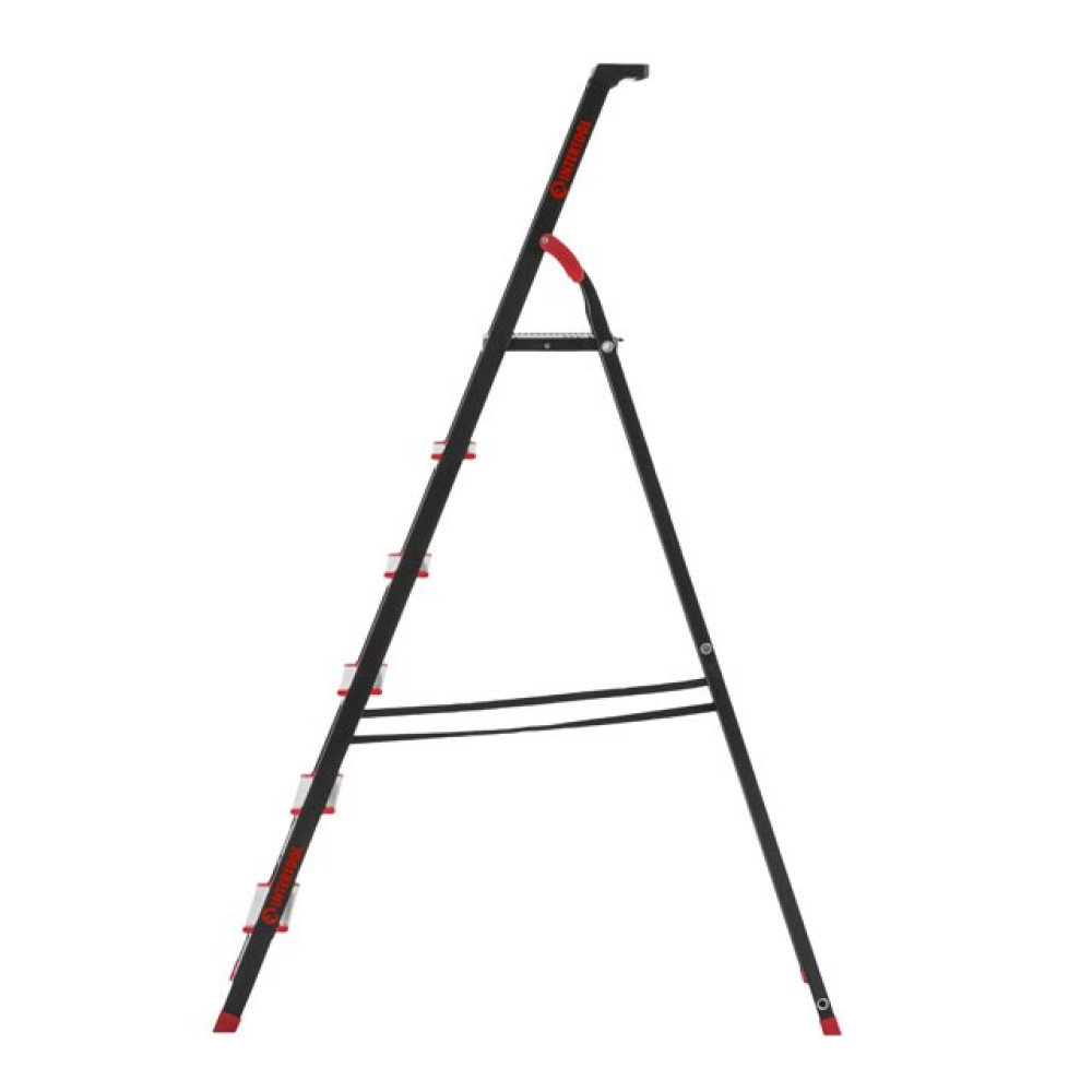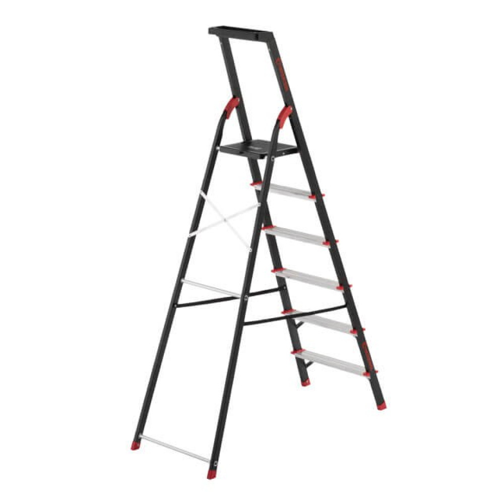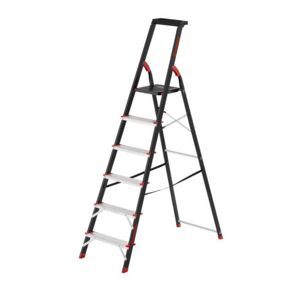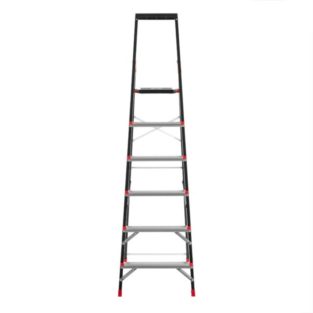 Драбина 6 сходинок, лоток для інвентарю, сталевий профіль, висота верхньої сходинки 1280мм, 481х1138х1787мм,г - незамінний помічник у побуті та на роботі. Виготовлена з міцного та надійного матеріалу, забезпечуючи стабільність та безпеку при використанні. Складна конструкція дозволяє заощаджувати місце зберігання.