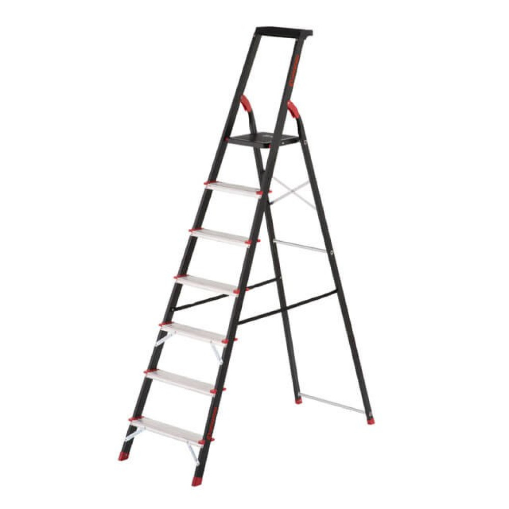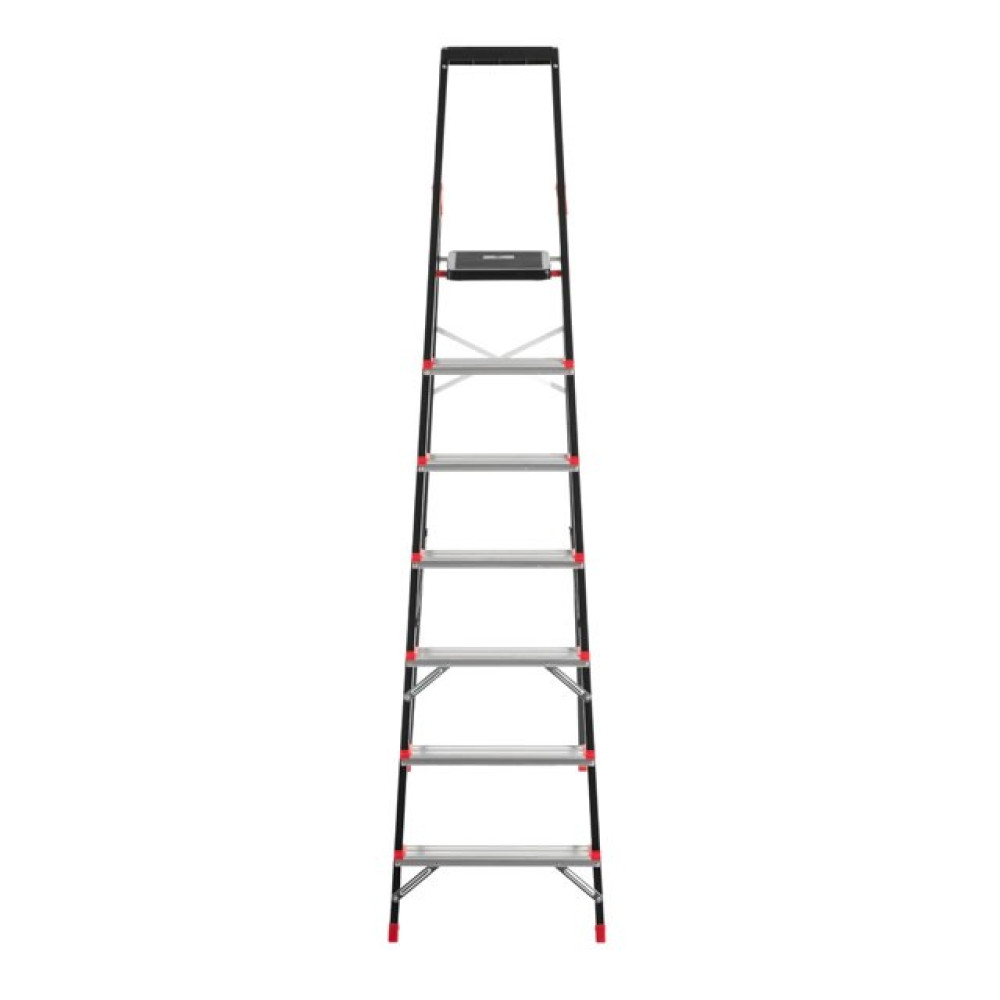Драбина 7 сходинок, лоток для інвентарю, сталевий профіль, висота верхньої сходинки 1500 мм, 504 * 1283 * 2003мм, - незамінний помічник у побуті та на роботі. Виготовлена з міцного та надійного матеріалу, забезпечуючи стабільність та безпеку при використанні. Складна конструкція дозволяє заощаджувати місце зберігання.
