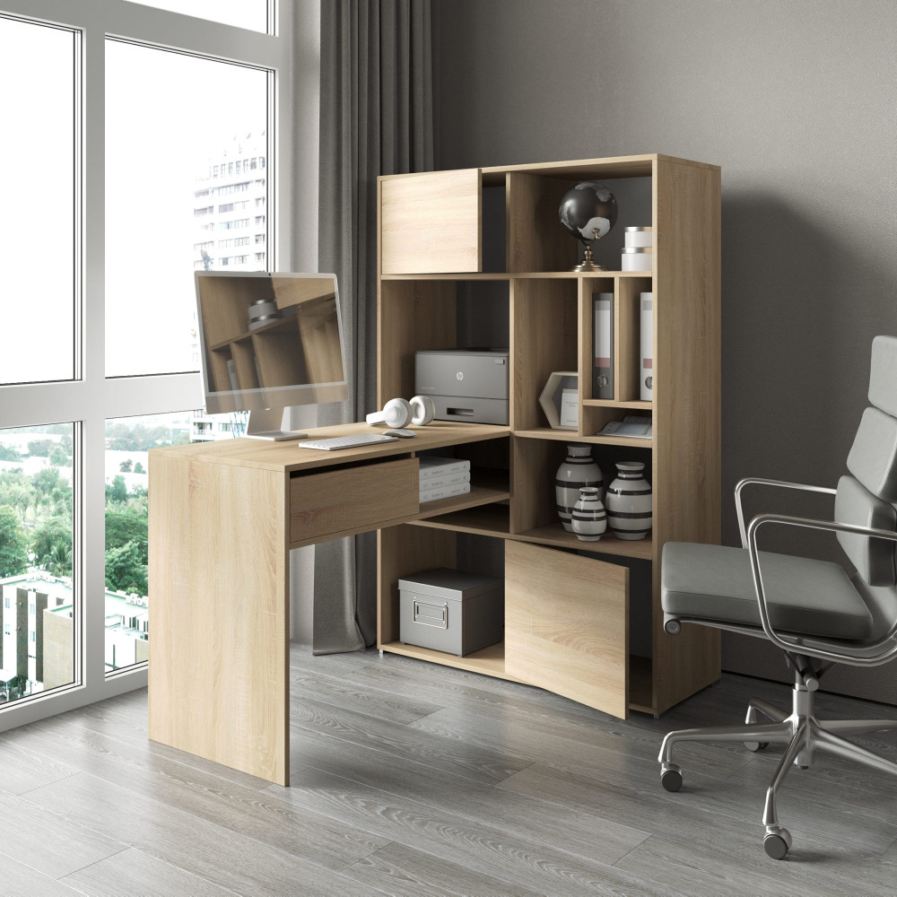 Кутовий комп'ютерний стіл із шухлядами та стелажем Дуб Сонома